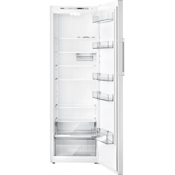 Холодильник выполнен в белом цветовом исполнении с наружной вертикальной ручкой-скобой серебристого цвета, которая подчеркивает эксклюзивный дизайн модели. В камере расположено 6 полок из закаленного стекла. На двери холодильника установлено 5 емкостей из ударопрочного пластика, в том числе емкость нижняя с ограничителем для бутылок и емкость верхняя с крышкой.